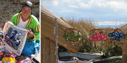 Após essa conversa, fomos convidados a conhecer por dentro as casas feitas da onipresente totora (que serve até como alimento!). Algumas mulheres aproveitaram para mostrar seus bordados e outros artesanatos. Em seguida, fomos presenteados com colares de boas-vindas e alguns turistas aproveitaram para navegar pelo lago nas canoas de (adivinha?) totora.