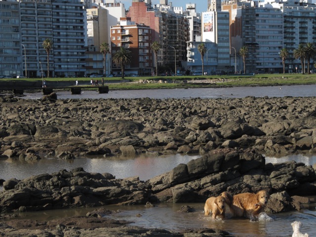 Cães aproveitam o verão em Montevidéu. Ao fundo, pessoas caminham no calçadão que passa por toda a orla da cidade.