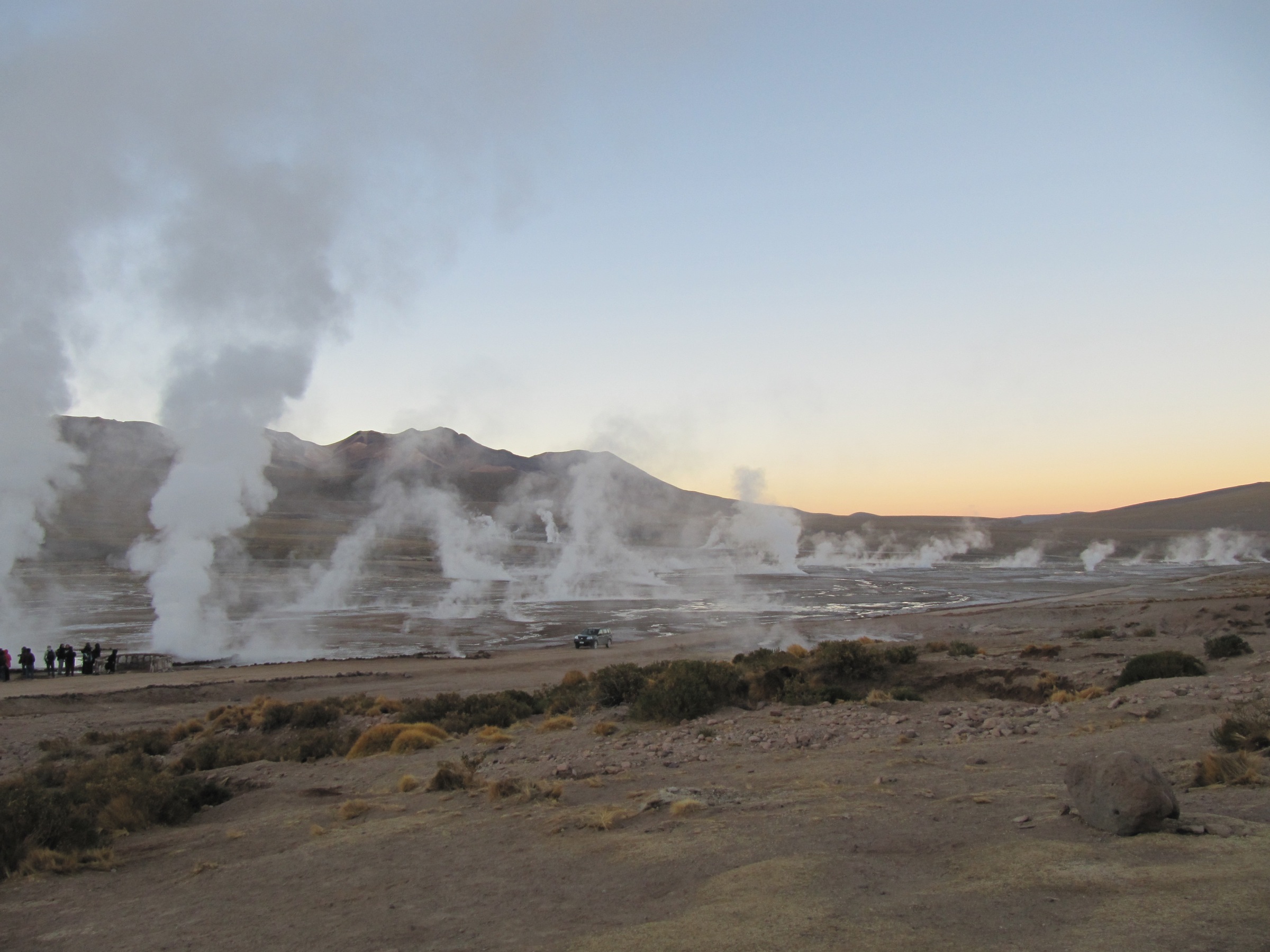 Quando chegamos em El Tatio, com o nariz congelando e a boca tremendo, ainda era noite. Não demorou e, lá pelas 06h00, os primeiros raios de sol foram aparecendo timidamente, revelando um verdadeiro cenário de ficção científica. É aí que nem um, nem dois, mas centenas de jatos de fumaça e água fervilhando brotam da terra, atingindo até 10 metros de altura.